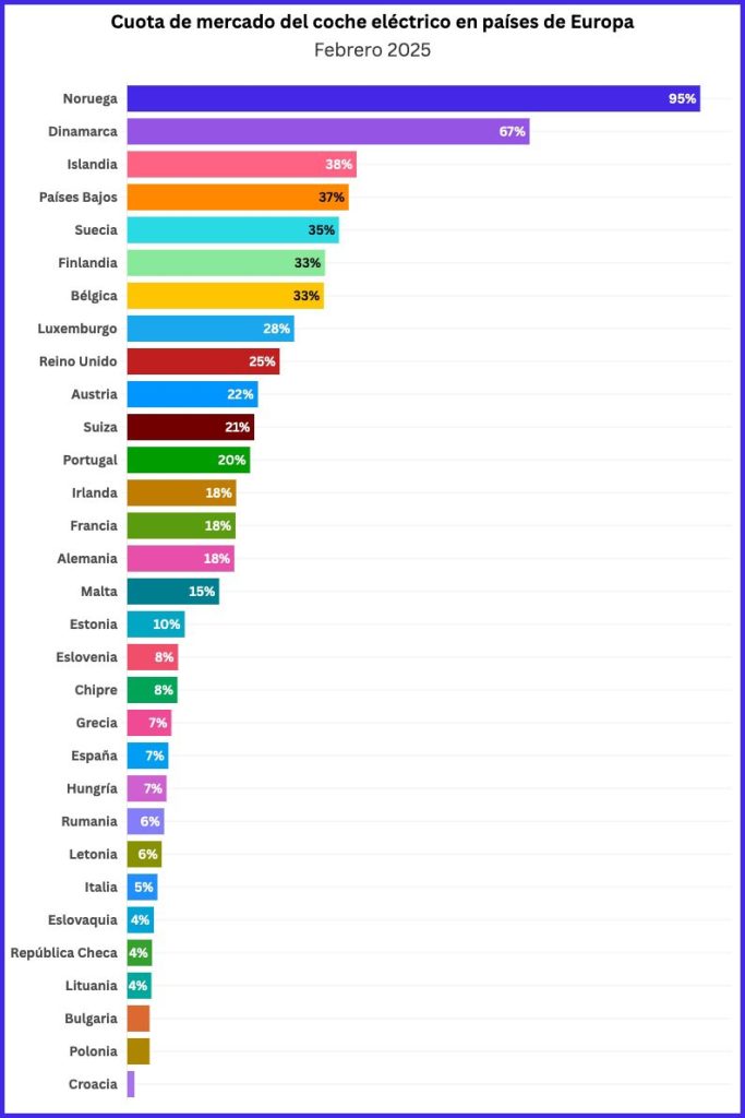 Otro país de Europa muy significativo en la adopción del coche eléctrico es Dinamarca, que consigue en febrero de 2025 alcanzar una cuota de mercado del 67 %. Islandia, Países Bajos, Suecia, Finlandia y Bélgica están por encima del deseado 30 %. Estos países son los que mayor adaptación a la movilidad eléctrica están teniendo en el mundo.