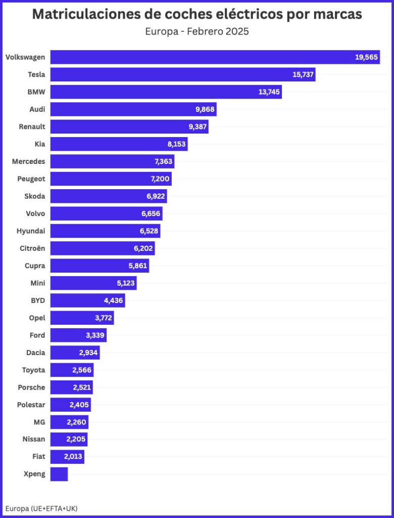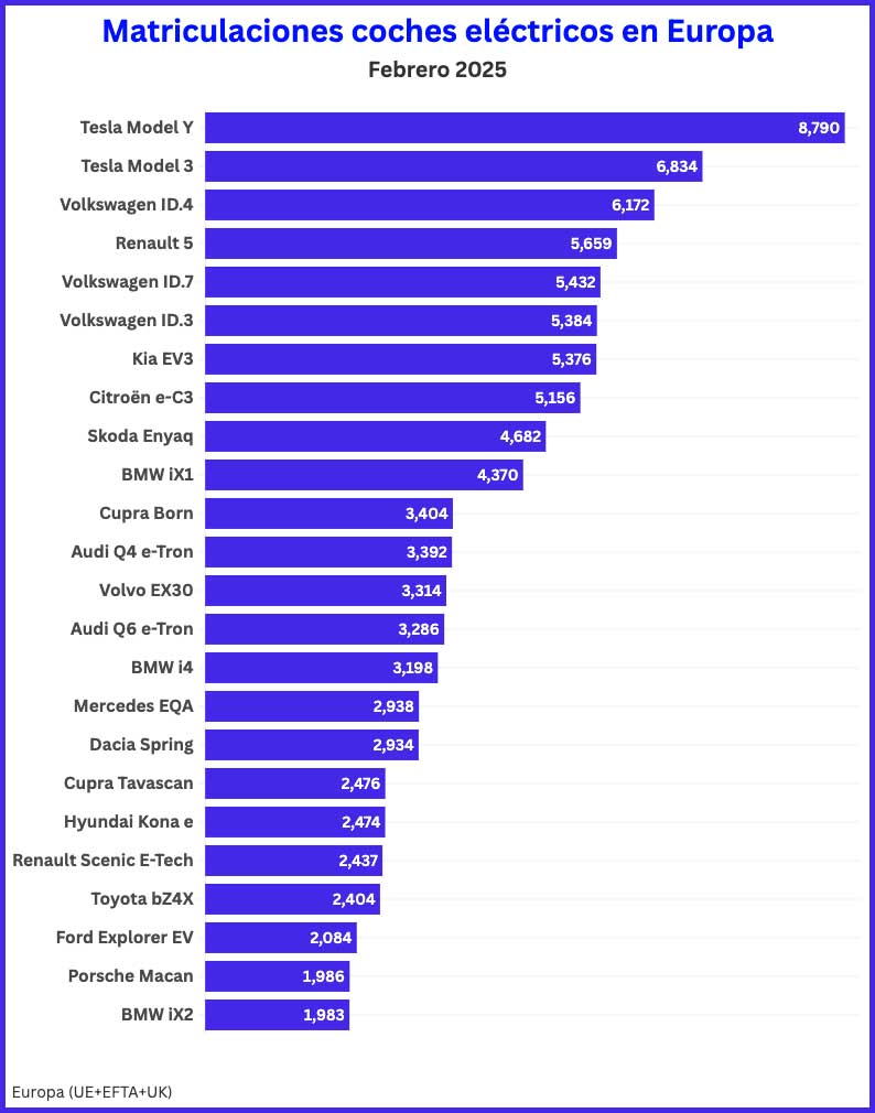 Vamos a analizar ahora los coches eléctricos que más se han vendido en Europa en el mes de febrero de este año. Está gráfica también nos arroja datos muy sorprendentes.