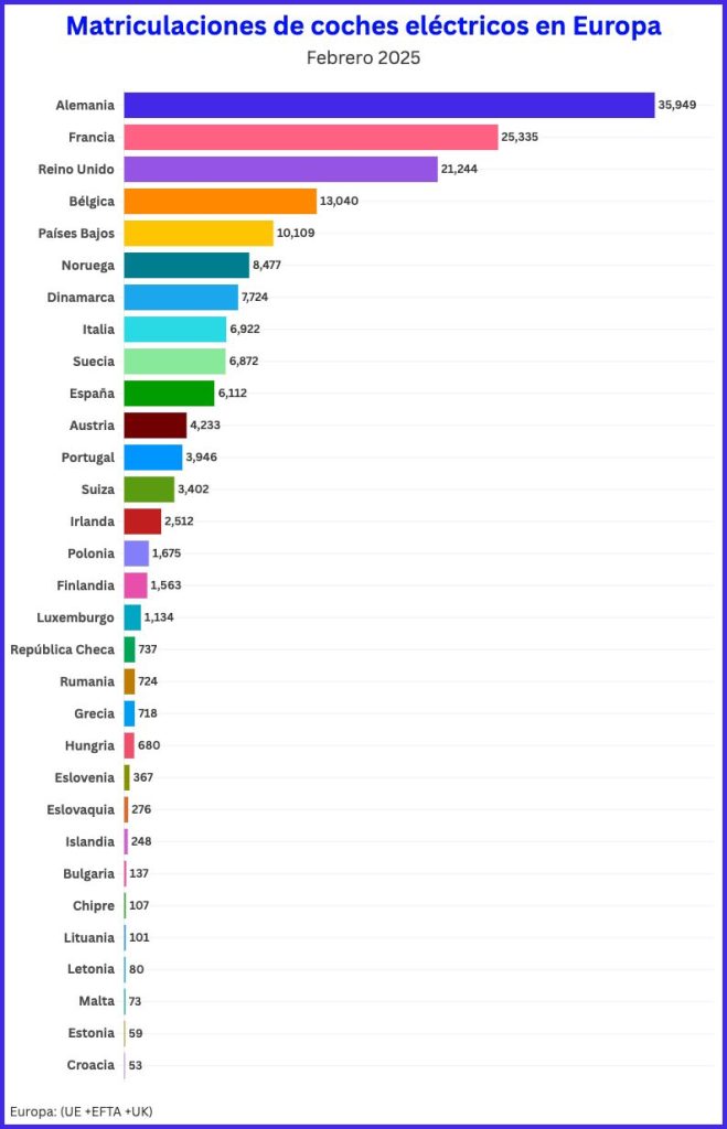 En la parte negativa está Italia con tan solo un 5 % y España con apenas un 7 %. Por el contrario nuestro país vecino Portugal consigue llegar a una cuota de mercado del 20 % en febrero de 2025.