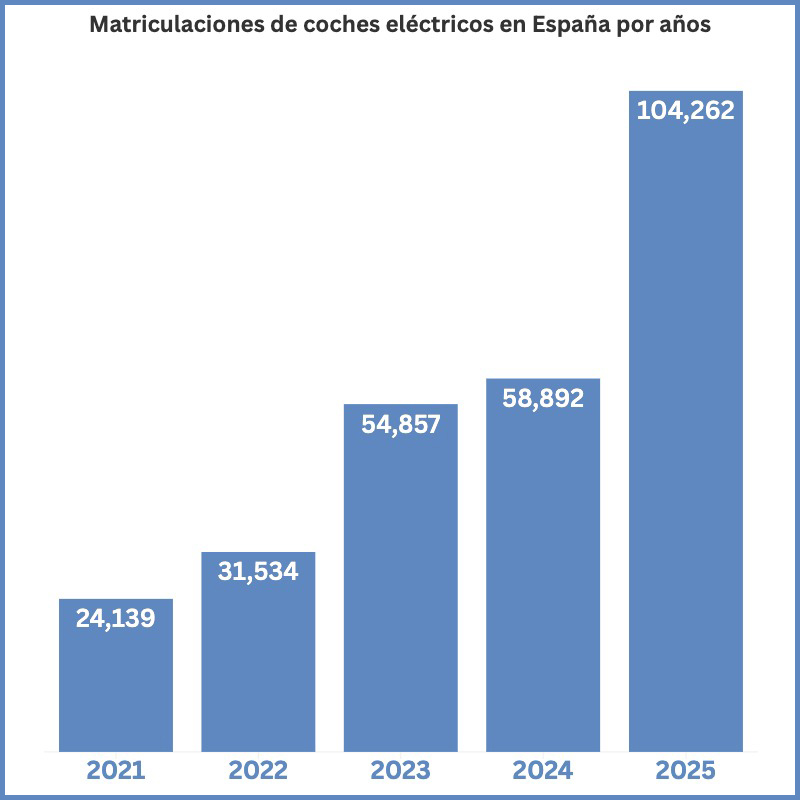A lo largo del año 2025 se han matriculado 104.262 coches eléctricos, una cifra que contrasta de forma contundente con las 58.892 unidades registradas en 2024 y que se traduce en un crecimiento interanual del 77 %.